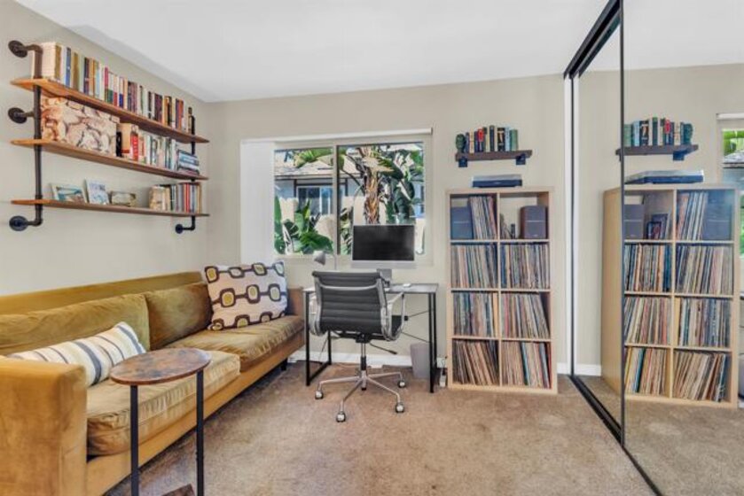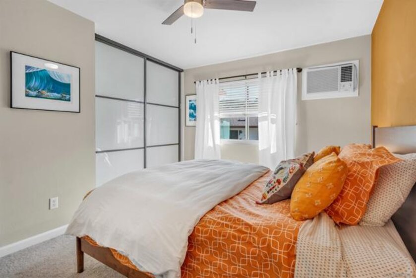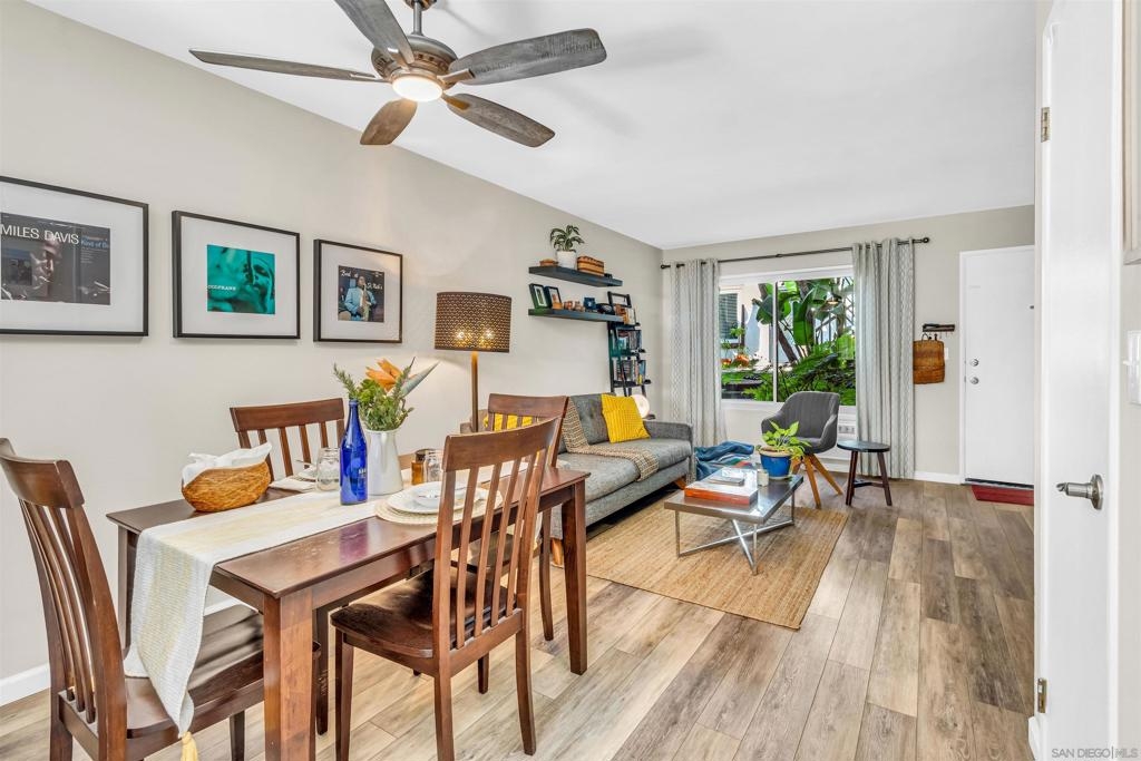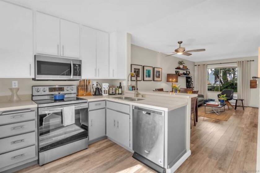 Own this lovely two-story townhome with rare private fenced patio in sought after San Carlos neighborhood! Open concept design combines the living room, dining area and kitchen, all flowing out to the entertainment patio. High End Wood-Like flooring throughout main areas, carpeted bedrooms. Stylish fixtures and upgrades throughout. Dual pane windows, new custom paint. New water heater, new dishwasher. Refreshed kitchen with quartz countertops, stainless appliances. Private fenced patio with 2 lemon trees and gate opening to green belt. One assigned garage-style parking space plus one additonal space with storage units. Washer/Dryer in garage area. Unit lovingly maintained, some new flooring, new A/C. Complex well maintained, just across the street from Mission Trails Park with mountain views! Carefree complex boasts community pool and park/playground. Move in Ready!