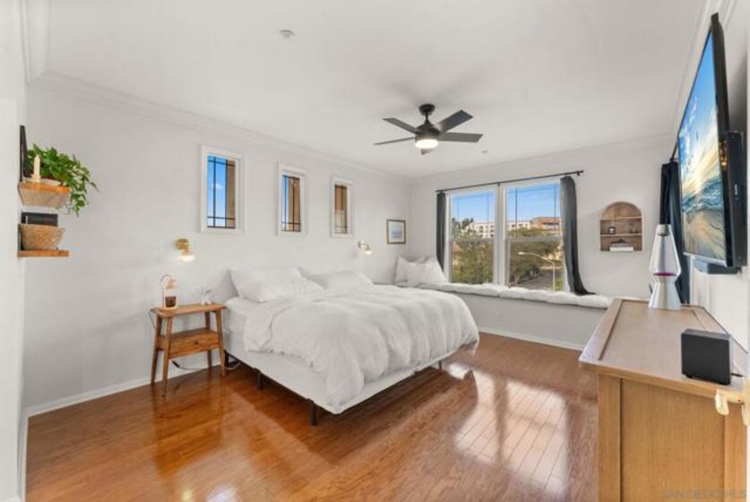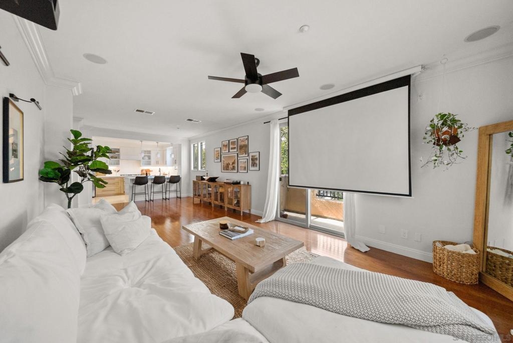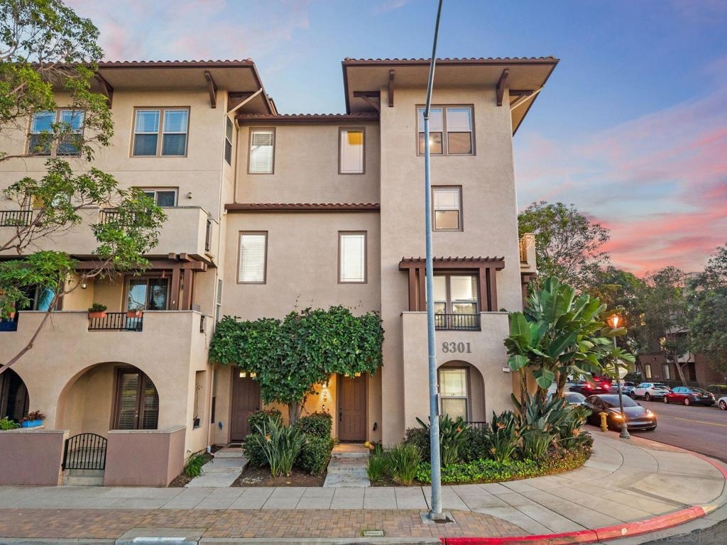 Impeccably maintained and thoughtfully upgraded, this tri-level corner home offers refined urban living within Mission Walk, a sought-after community located in the heart of Mission Valley with exceptional proximity to everything San Diego has to offer. Freshly painted interiors and upscale lighting create a bright, polished atmosphere throughout, while wood flooring, crown molding, plantation shutters, and surround sound add warmth and sophistication. The remodeled kitchen is both stylish and functional, featuring quartz countertops, shaker-style cabinetry, stainless steel appliances, and a breakfast bar that flows seamlessly into the main living space—ideal for everyday living and entertaining. A private balcony off the living room provides the perfect setting for morning coffee or evening relaxation. The spacious primary suite serves as a true retreat, complete with a walk-in closet with custom built-ins and a beautifully appointed en-suite bath with dual vanities, a soaking tub, and a separate walk-in shower. Additional bathrooms have been tastefully remodeled, and the home is further enhanced by an elevator, in-unit laundry room, tankless water heater, whole-house fan, water softener and purifier, and Google Web Pass. A two-car attached garage adds convenience and storage. Residents of Mission Walk enjoy the benefit of low HOA dues of just $290/mo., making this an exceptional value in Mission Valley. Ideally positioned near shopping, dining, river trails, San Diego Bay, downtown, and with easy access to the 5, 805, and 163 freeways.