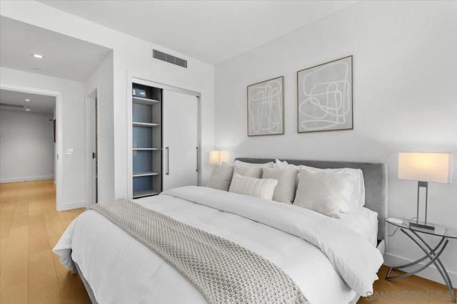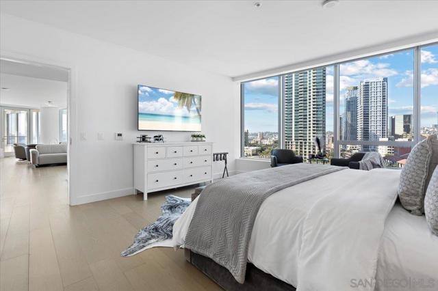 Immerse yourself in elevated coastal living at Pacific Gate, San Diego's prized residential tower. Perched on the 10th floor, this light and bright 2-bed + den, 2.5-bath corner residence captures panoramic bay and city views through sweeping walls of glass. Thoughtfully designed, this spacious layout offers an open-concept living area wrapped in natural light, a sleek chef’s kitchen with premium Wolf, Sub-Zero, and Miele appliances, and beautifully curated finishes throughout. The spacious primary suite features a spa-inspired bathroom and generous walk-in closet by California Closets, while the secondary on-suite bedroom provides privacy for guests and incredible Bay views. Den/office offers flexibility as a 3rd bed or a private home office. The large private covered terrace offers an inviting space to unwind and enjoy San Diego’s vibrant sunsets. Resort amenities include a 45' yacht share, luxury car fleet, chef concierge, a guest suite, pool terrace w/cabanas, residents lounge w/catering kitchen, a state-of-the-art fitness center w/sauna and steam room, screening room, dog run, and an onsite celebrity chef-owned restaurant. Enjoy the coastal luxury lifestyle in San Diego's only Super Prime residential tower. Pacific Gate is located in Millionaire's Row and steps from the harbor, Seaport Village, the Rady Shell, restaurants, and luxury boutique shops. The first all-glass Super Prime residential tower in San Diego offers an unprecedented waterfront lifestyle with sky-high amenities and picture-postcard views. Directly overlooking the waterfront, the 41-story tower contains an exclusive offering of homes designed by Hirsch Bedner Associates. Renowned New York-based architectural firm Kohn Pedersen Fox (KPF) created a landmark that reimaged the San Diego skyline. The custom-engineered glass walls dynamically reflect the hues of the sky and the Pacific Ocean. Pacific Gate has evolved the San Diego skyline and represents the future of the city. The building is comprised of two-nested curved glass towers that rise as a single column from a three-story ground-floor retail podium on the north and west sides of the tower. Because of the building’s curves and exterior glass, Pacific Gate offers a striking viewing experience from every vantage point.