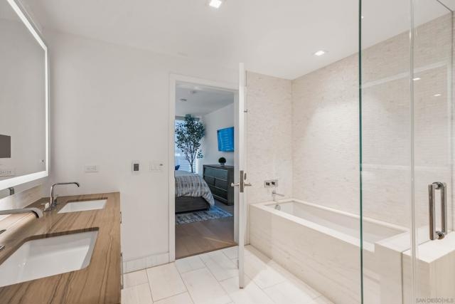 Experience luxury high-rise living at Pacific Gate on the iconic Downtown San Diego Waterfront district. Perched on the 22nd floor, this light-filled 2 bed, 2 bath, 1,390 square foot residence offers dazzling city lights and sparkling bay views—high enough to clear the Intercontinental Hotel while capturing the charm of the historic Santa Fe Depot. The open-concept layout is enhanced by custom upgrades, including a sleek modern entertainment center in the living room and a spacious walk-in closet in the primary suite. The desirable split-bedroom floor plan provides privacy, while expansive windows frame the stunning vistas. Enjoy San Diego’s mild climate from your private covered terrace, perfect for morning coffee or evening sunsets. Pacific Gate residents indulge in resort-style amenities such as a private yacht share, luxury car fleet, 24/7 concierge, guest suite, resident’s lounge, a state-of-the-art fitness center with sauna and steam room, on-site celebrity chef restaurant, and much more! This is the perfect blend of luxury, comfort, and world-class convenience. The first all-glass Super Prime residential tower in San Diego offers an unprecedented waterfront lifestyle with sky-high amenities and picture-postcard views. Directly overlooking the waterfront, the 41-story tower contains an exclusive offering of homes designed by Hirsch Bedner Associates. Renowned New York-based architectural firm Kohn Pedersen Fox (KPF) created a landmark that reimaged the San Diego skyline. The custom-engineered glass walls dynamically reflect the hues of the sky and the Pacific Ocean. Pacific Gate has evolved the San Diego skyline and represents the future of the city. The building is comprised of two-nested curved glass towers that rise as a single column from a three-story ground floor retail podium on the north and west sides of the tower. Because of the building’s curves and exterior glass, Pacific Gate offers a striking viewing experience from every vantage point. Residents arrive home to a beautifully landscaped motor court with a private luxury car fleet, which leads to a double-height lobby with a 24-hour concierge and porter services. Two levels of amenities boast a residents lounge ideal for events and everyday use, the fitness center contains an extensive range of state-of-the-art equipment. Adjacent to the fitness center is the steam and sauna retreats that open up to the fourth-floor pool terrace fitted with poolside cabanas and glass surround.
