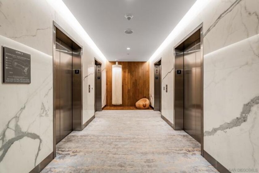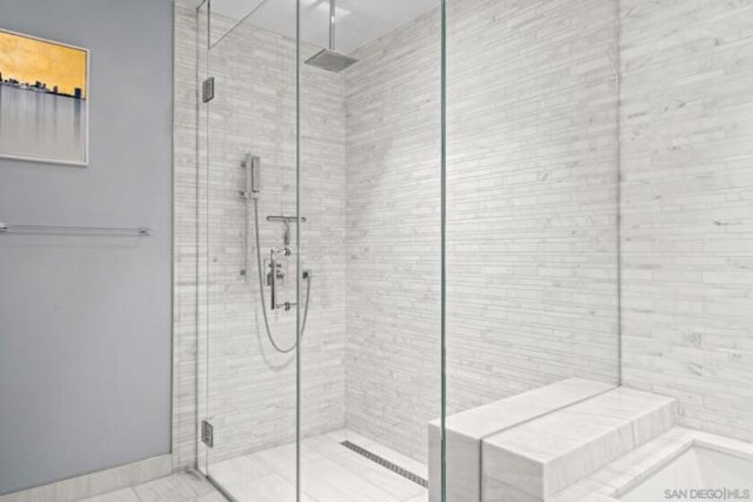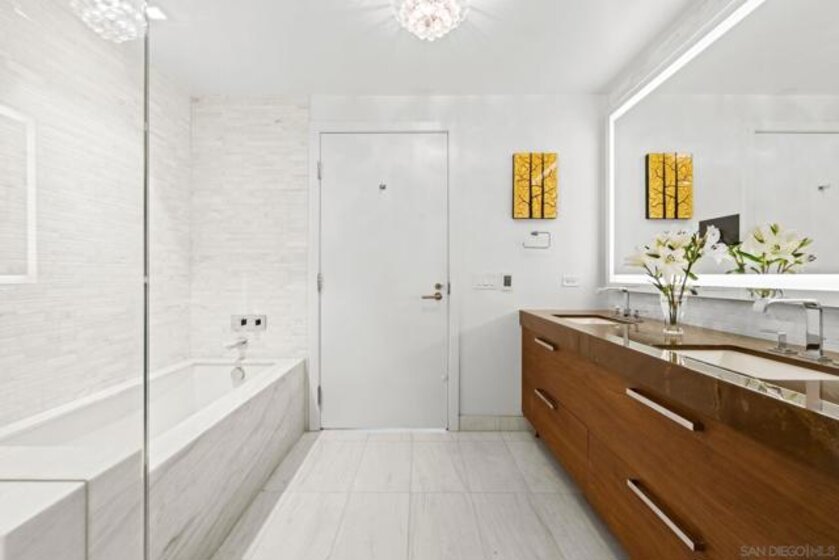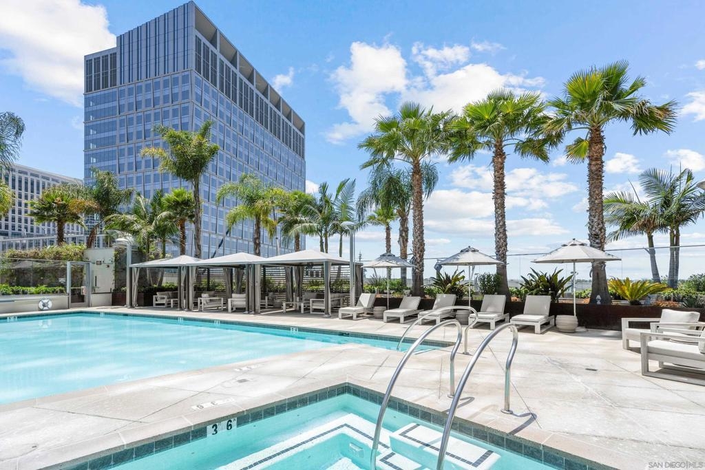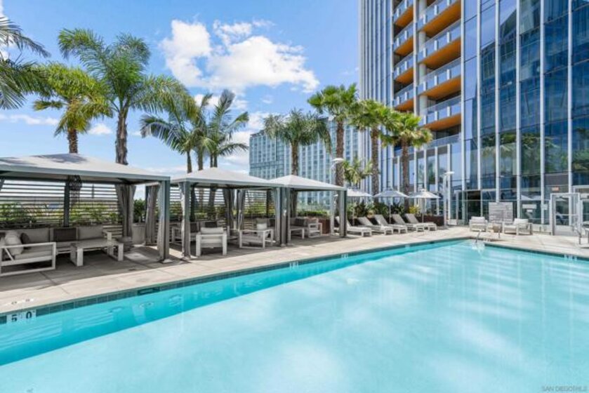 Experience luxury coastal living in this beautiful west-facing residence with soft sunset and glistening bay views. Featuring one of the largest private covered terraces at Pacific Gate, this unique floor plan offers an expansive outdoor retreat rarely found in high-rise living. The gourmet kitchen showcases touch-open cabinetry, Sub-Zero, Wolf, and Miele appliances, plus a wine chiller. The dining and living areas are enhanced with California Closets built-ins, including a multi-functional pantry, floating wine glass cabinet, and a built-in Napoleon electric fireplace. Control media, climate, lighting, and window shades with ease through the in-home panel or ELAN mobile app. The primary suite features dual California Closets valets and a spa-like bath with heated floors, walk-in shower, soaking tub, and LED mirror with integrated TV. Privately located along a quiet corridor in the building, this residence offers convenient access to the business center, conference room, and screening room, ideal for a work-from-home lifestyle. Pacific Gate amenities include 24/7 concierge and security, private yacht and luxury car fleet, resort-style pool and spa, sauna, steam room, fitness center, and outdoor spaces with BBQs, fire pits, and lounges. Residents also enjoy a community and screening room for hosting. Includes 2 premier parking spaces and a large private storage unit on P1. Ideally located in the heart of San Diego’s waterfront, just moments from top dining, parks, and everyday conveniences. Residence 307 brings together privacy, comfort, and a resort-style feel. The first all-glass Super Prime residential tower in San Diego offers an unprecedented waterfront lifestyle with sky-high amenities and picture-postcard views. Directly overlooking the waterfront, the 41-story tower contains an exclusive offering of homes designed by Hirsch Bedner Associates. Renowned New York-based architectural firm Kohn Pedersen Fox (KPF) created a landmark that reimaged the San Diego skyline. The custom-engineered glass walls dynamically reflect the hues of the sky and the Pacific Ocean. Pacific Gate has evolved the San Diego skyline and represents the future of the city. The building is comprised of two-nested curved glass towers that rise as a single column from a three-story ground floor retail podium on the north and west sides of the tower. Because of the building’s curves and exterior glass, Pacific Gate offers a striking viewing experience from every vantage point. Residents arrive home to a beautifully landscaped motor court with a private luxury car fleet, which leads to a double-height lobby with a 24-hour concierge and porter services. Two levels of amenities boast a residents lounge ideal for events and everyday use, the fitness center contains an extensive range of state-of-the-art equipment. Adjacent to the fitness center is the steam and sauna retreats that open up to the fourth-floor pool terrace fitted with poolside cabanas and glass surround.